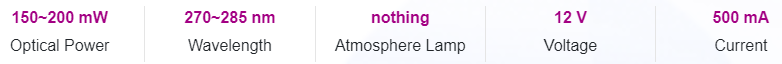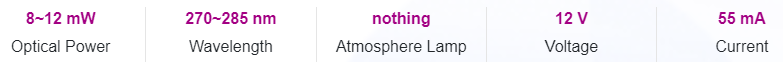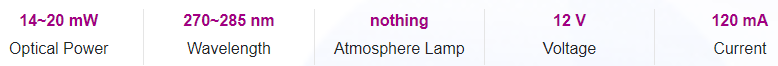 UVC photoelectric parameters and spec range (TA = 25 ℃, Rh = 30%)