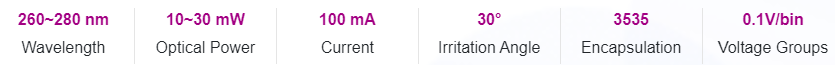 UVC photoelectric parameters and spec range (@ 100mA, Ta = 25 ℃, Rh = 30%)