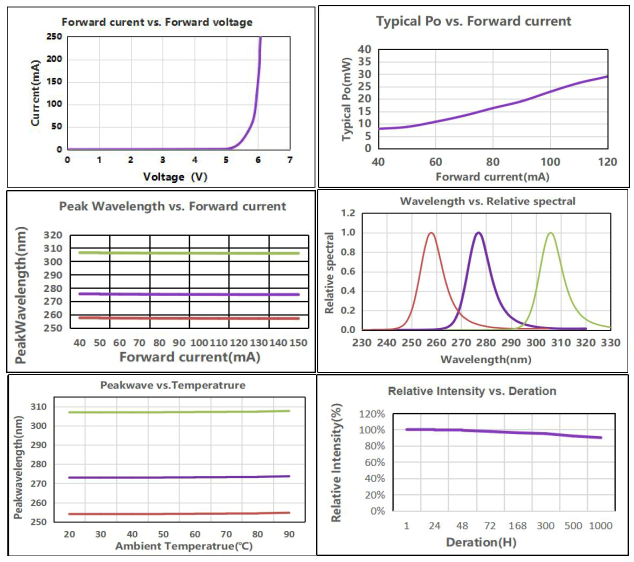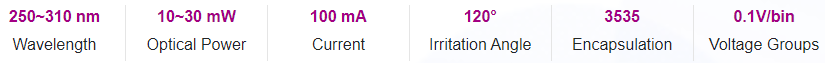 UVC photoelectric parameters and spec range (@ 100mA, Ta = 25 ℃, Rh = 30%)