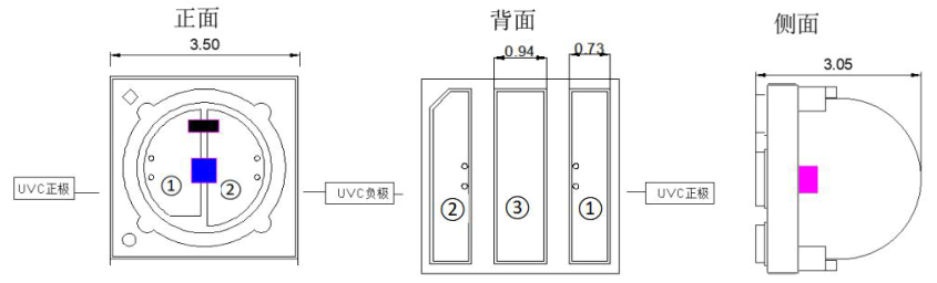 - As shown in the above figure, â‘ is the positive electrode of UVC, â‘¡ is the negative electrode of UVC; â‘¢ It is a heat dissipation pad;