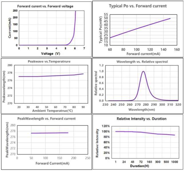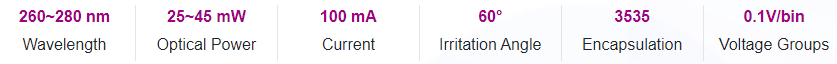 UVC photoelectric parameters and spec range (@ 100mA, Ta = 25 ℃, Rh = 30%)
