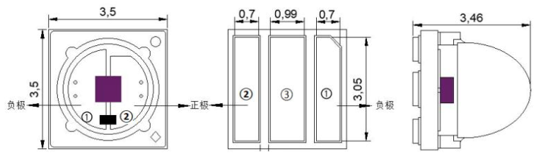 - Package: 3535, overall size: 3.5 × three point five × 3.46 (L × W × H) [Unit: mm]