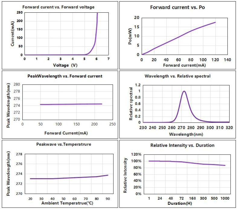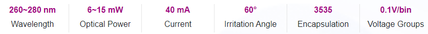UVC photoelectric parameters and spec range (@ 40mA, Ta = 25 ℃, Rh = 30%)