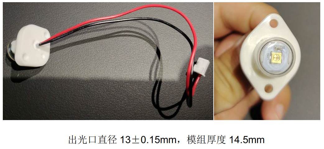The bottom of the module is equipped with flange edge and two mounting holes, which is suitable for static UVC led bacteriostatic module for bacteriostasis of air and liquid; The recommended opening size is 16.7 ± 0.3 mm.