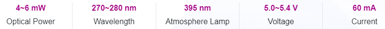 Constant current drive: uva 20mA + UVC 40mA = 60mA, voltage 5.0-5.4v