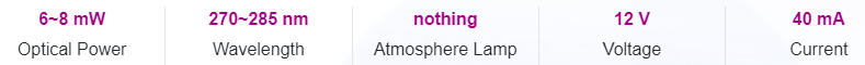 UVC photoelectric parameters and spec range (TA = 25 ℃, Rh = 30%)