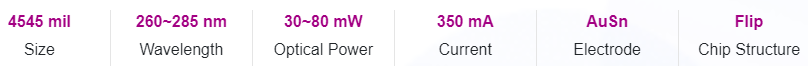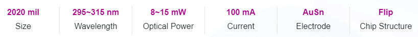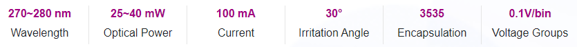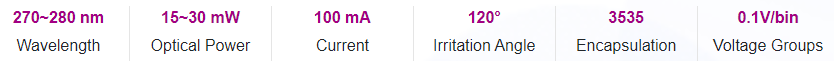 UVC photoelectric parameters and spec range (@ 100mA, Ta = 25 ℃, Rh = 30%)